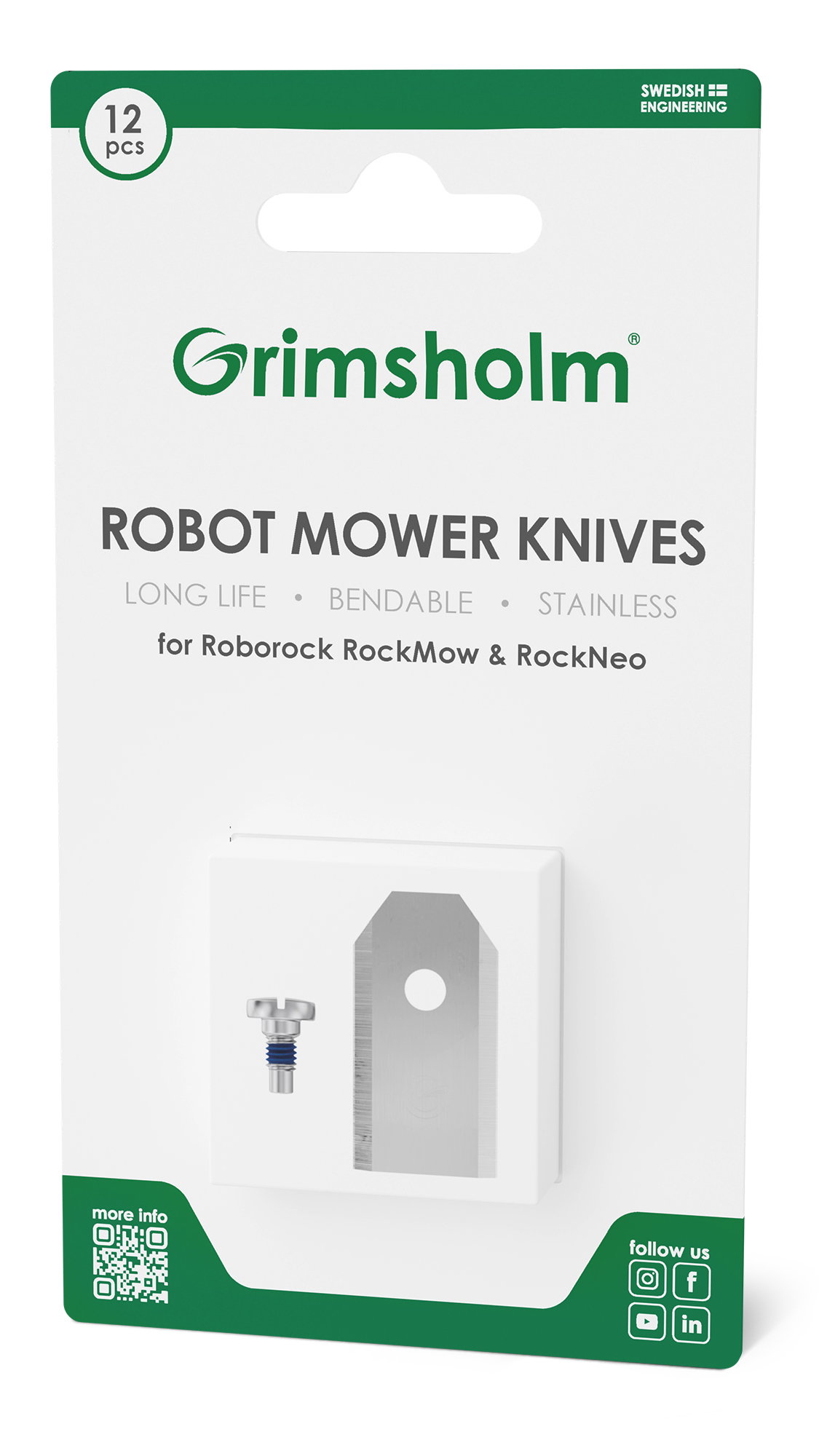 Grimsholms knivar för Roborock är tillverkade i rostfritt stål och har optimerats för bästa tänkbara balans mellan hållfasthet, skärpa och slittålighet för optimalt klippresultat.