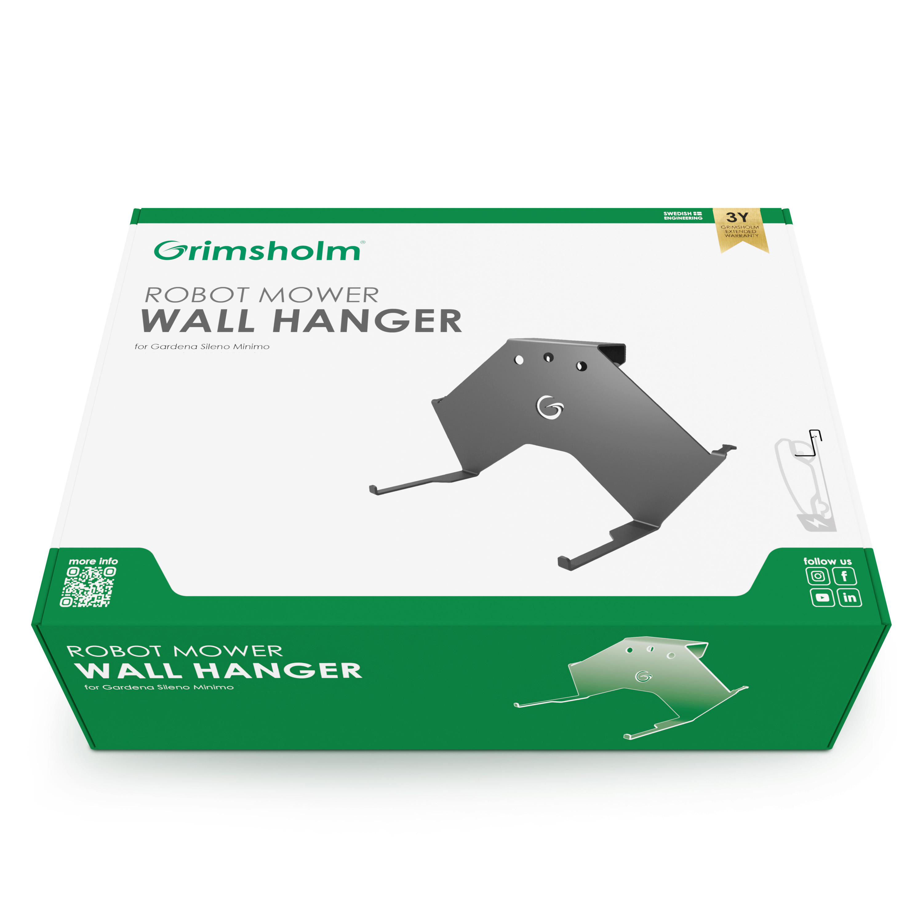 Met een muurhanger van Grimsholm is uw robotmaaier onderhoudsvrij terwijl hij voor de winter wordt opgeborgen en bespaart u waardevolle vloerruimte in de garage.